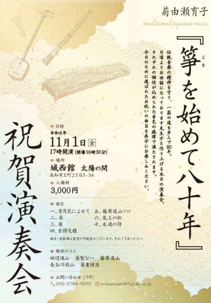 【11/1】「箏を始めて八十年」祝賀演奏会 2024/10/1 出演情報 ◆日程:2024年11月1日(金) 17時00分開演 ◆会場:城西館 太陽の間 ◆出演曲目:吉祥文様、尾上の松 一覧ページに戻る