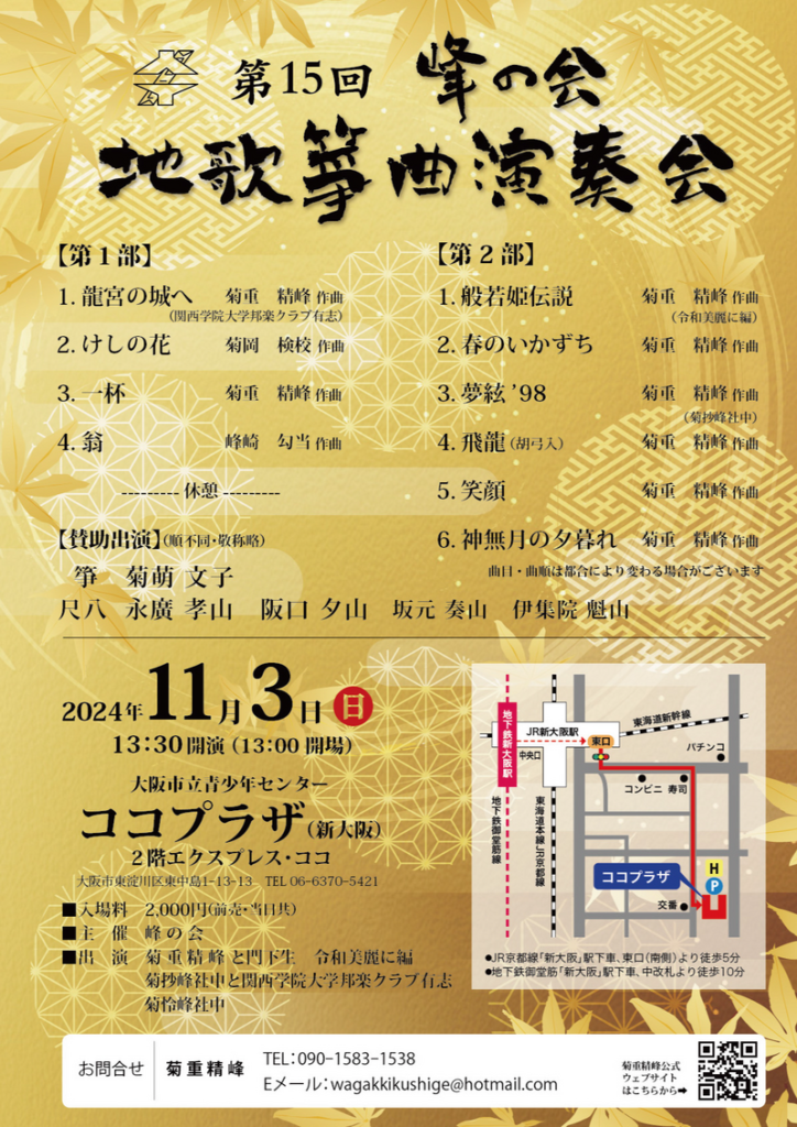 【11/3】第15回 峰の会 地歌箏曲演奏会 2024/10/1 出演情報 ◆日程:2024年11月3日(月) 13時30分開演 ◆会場:ココプラザ 2階 エクスプレス・ココ ◆出演曲目:一杯、般若姫伝説、飛龍、笑顔、神無月の夕暮れ 一覧ページに戻る