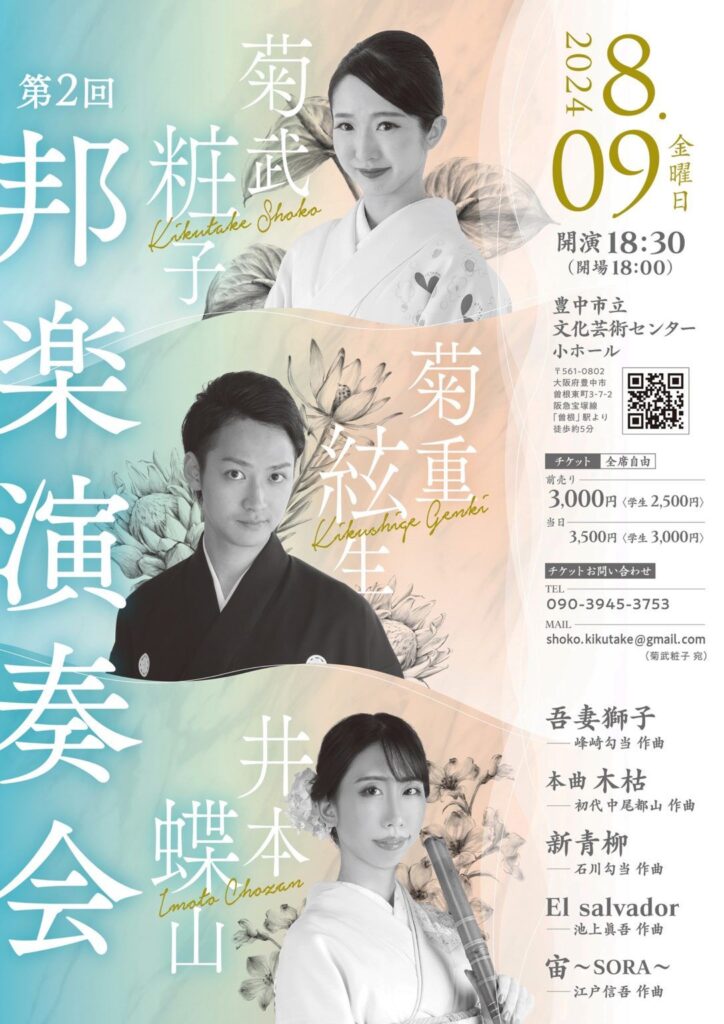 【8/9】第2回 邦楽演奏会 2024/7/1 出演情報 ◆日程:2024年8月9日(金) 18時30分開演 ◆会場:豊中市立文化芸術センター 小ホール ◆出演曲目:吾妻獅子、新青柳、El Salvador、宙〜SORA〜 一覧ページに戻る